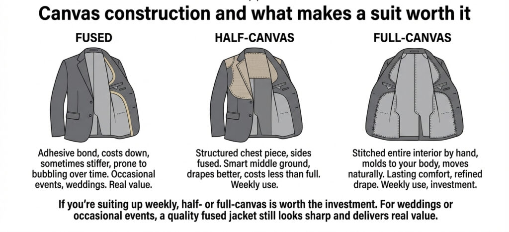 If you’re suiting up weekly, half- or full-canvas is worth the investment. For weddings or occasional events, a quality fused jacket still looks sharp and delivers real value.