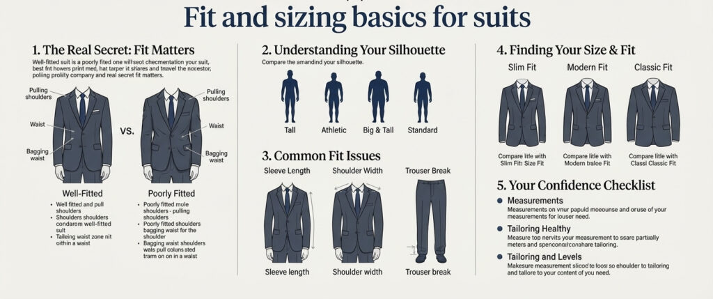 In the sections ahead, we’ll walk you through how to find your perfect suit size, compare slim fit, modern fit, and classic fit options, and help you avoid the most frequent mistakes. Think of this as your confidence-building checklist, especially if you’re new to suiting or shopping for your first big moment.