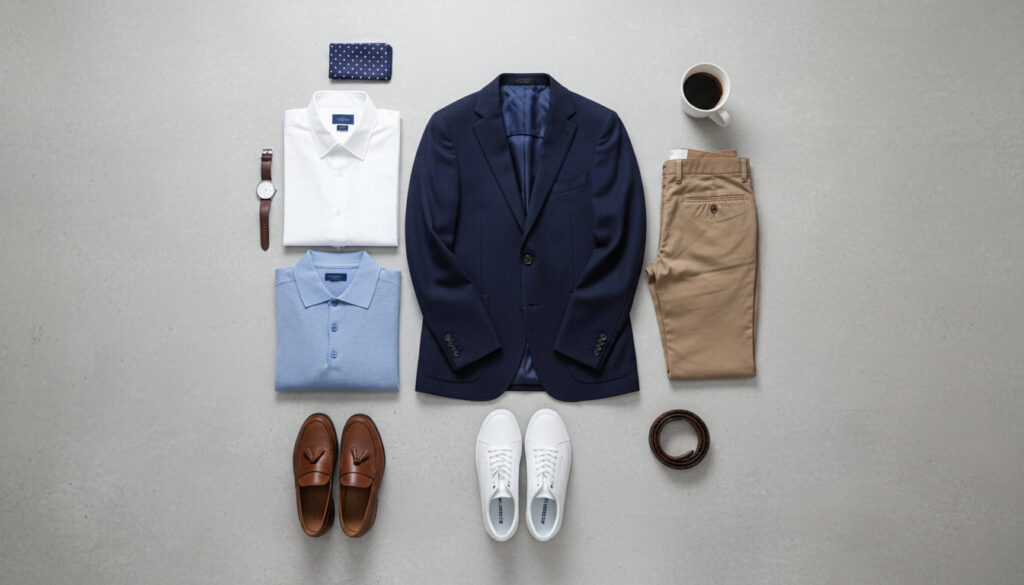 Men’s Wearhouse premium labels emphasize fabric sourcing, construction quality, and design details that enhance professional credibility. While initial investment is higher, cost-per-wear calculations often favor quality pieces over budget alternatives. Mastering business casual in 2025 requires understanding modern workplace realities while maintaining professional standards. The key lies in building a versatile wardrobe around performance fabrics, neutral colors, and quality construction that adapts to hybrid work environments.