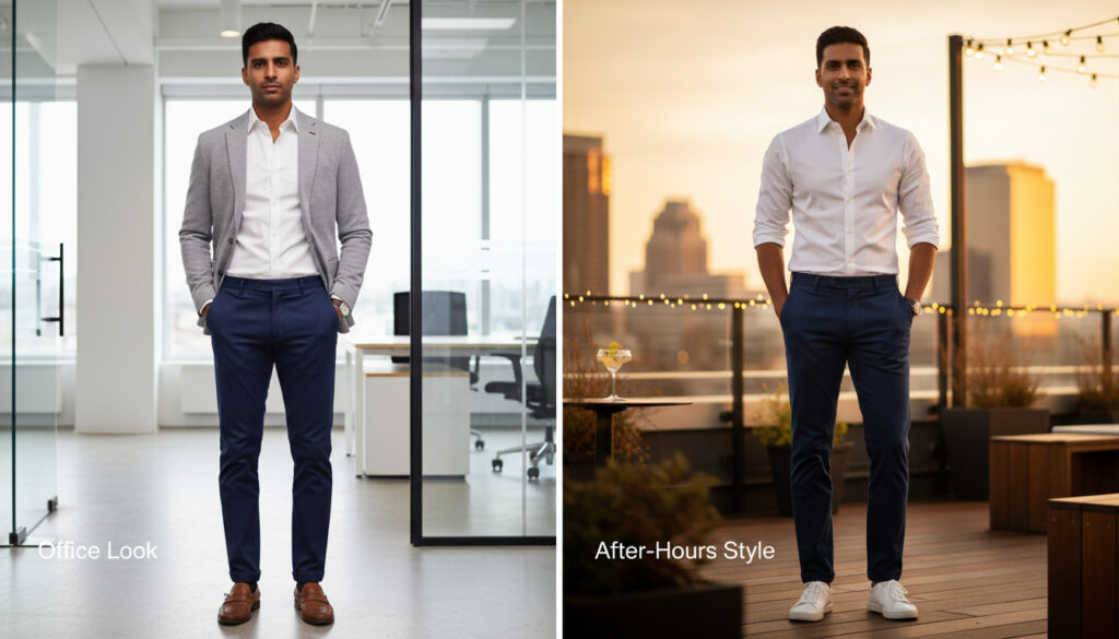 Modular dressing enables quick transitions from professional to social settings with minimal wardrobe changes. Swap dress shoes for clean sneakers, remove blazers, or roll shirt sleeves for instant casual transformation.