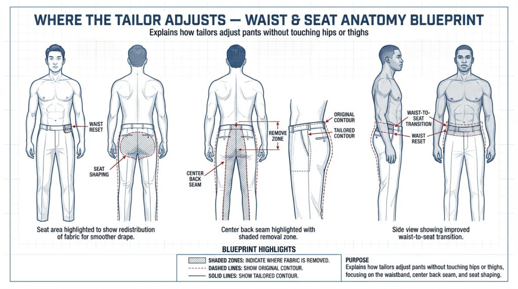 Trouser waist alterations are best for fine-tuning fit, not changing sizes. Most tailors adjust at the center back seam; how far you can go depends on seam allowance, pocket placement, and keeping the seat and rise balanced so the pants still hang cleanly (no twisting or diagonal pull).
