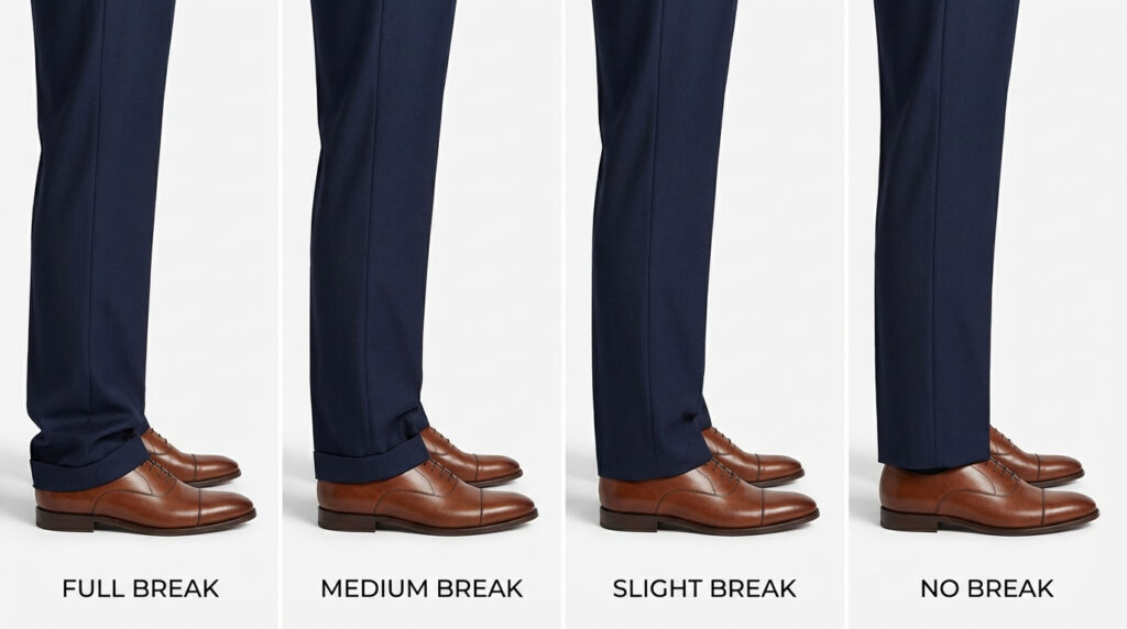 - Pants break adjustment for proper drape over shoes