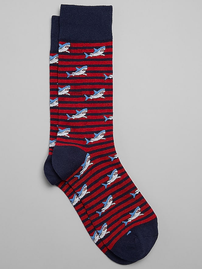Enjoy jaw-dropping style as you dive into these fin-credible socks. With ferocious sharks over bold stripes in a comfy cotton blend, these mid-calf cozies have a lot of bite. From your work week to Shark Week, they're ready for the next style attack.