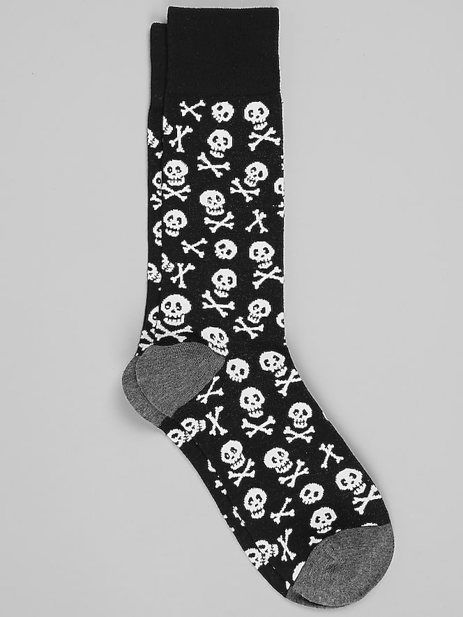 Ready to give your feet some attitude? These skull motif socks are the perfect way to add a little bit of edge to your everyday style. Made from a soft and breathable cotton blend with just the right amount of stretch, theyll keep your feet comfortable all day long. The snug ribbed cuffs will keep them from slipping down, while the reinforced heels and toes ensure they can handle whatever your day throws at you. So whether you're rocking them with sneakers or boots, you can be sure your feet look and feel great.