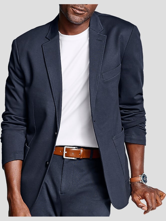 Dress code: Effortlessly sharp. This modern fit knit blazer has you covered from boardroom musings to date-night vibes. Soft, stretchy, and lightweight, it moves as you do, while the classic notched collar and two-button detail keep things timelessly dapper. Pair it with jeans for a smart-casual flex or dress pants for a polished finish. Confidence looks good on you, and with this blazer, it feels even better. Quiet luxury? Loud compliments.