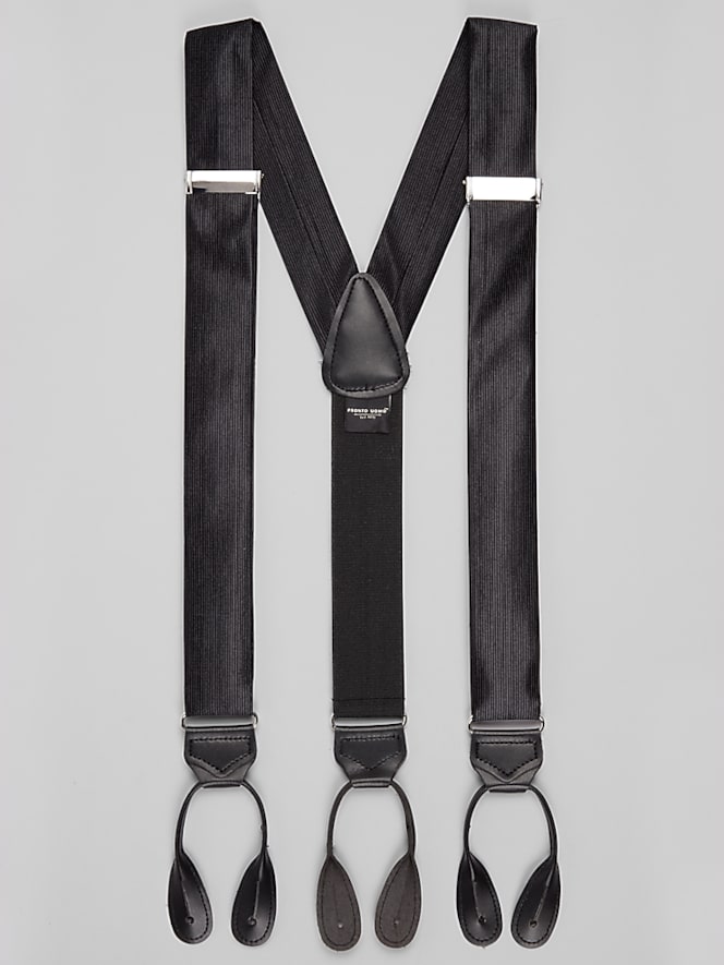 Keep your headand your pantsheld high with these stupendous suspenders. Fancifully fashioned from a fine silk blend, this Pronto Uomo accessory is richly ribbed for texture and grip that your dress wear will thank you for. Be it a power lunch, a professional dinner, or prom night, your look will be braced for stylish suspense.