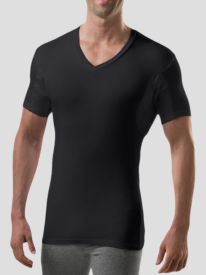 Say goodbye to under-the-shirt drama with this sweat-resistant V-neck undershirt, thanks to the patented Hydro-Shield Sweatproof technology. Perfected for those who live life minimally but stylishly, its slim fit hugs your frame for a sleek, tailored look. Lightweight and breathable, this marled gray essential works like a charm as a baselayer or on its own for laid-back casual vibes. It's all about quiet luxury and effortless comfort—soft, durable rayon fabric that keeps you cool and dry throughout the day. With a hit-at-hip length and short sleeves for easy layering, this is your new go-to for discreet confidence. Style it, sweat it, live in it!